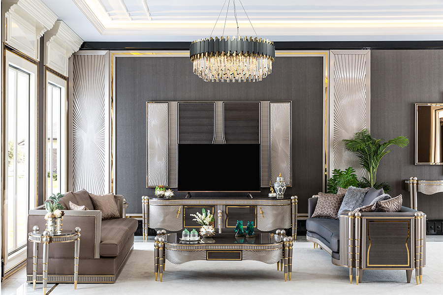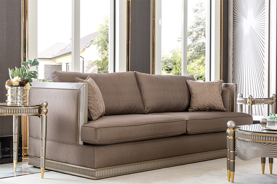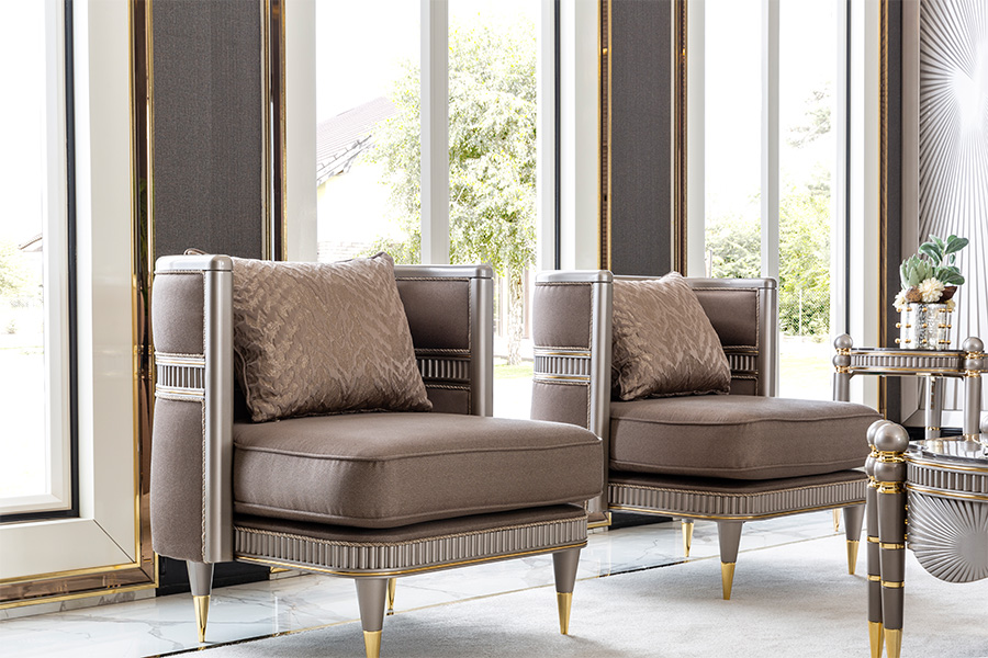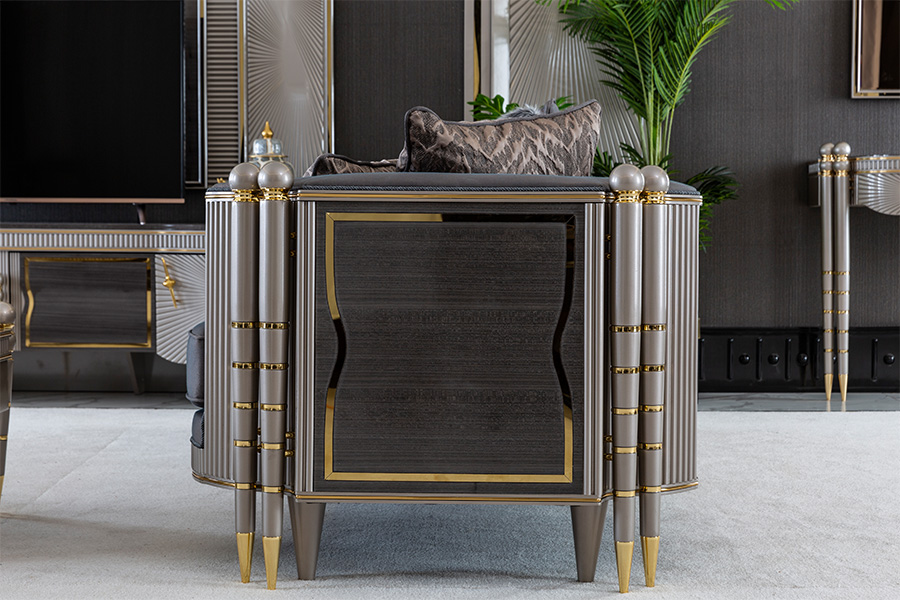 Virginia Koltuk Takımı, güçlü duruşu ve zarif detaylarıyla modern yaşam alanlarına sofistike bir kimlik kazandırıyor. Parlak kumaş dokusu, altın renk geçişleri ve ışığı yansıtan yüzeylerle birleşerek göz alıcı bir atmosfer yaratıyor.