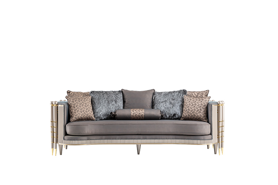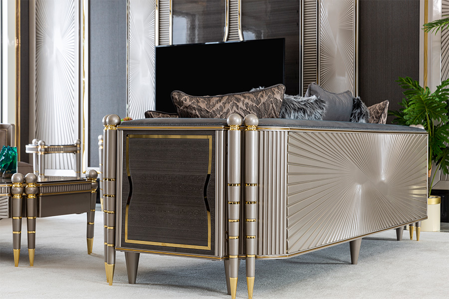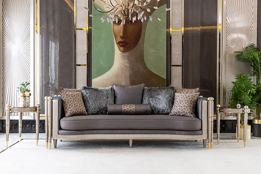 Yumuşak dokulu döşemeleri ve ergonomik yapısıyla hem estetik hem de konforu bir arada sunan bu takım, çizgisel formlar ve metalik detaylarla tamamlanarak iç mekânlarda dengeli bir lüks hissi oluşturuyor.